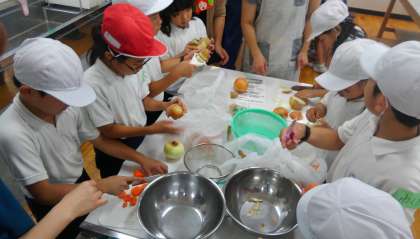 カレー班は、ピーラーで皮をむいたり、玉ねぎを切ったりしました。「お母さんの気持ちがわかった。めっちゃ、目が痛い。」と涙をぬぐいながら切っている人もいました。