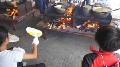 暑い中、火を起こすのも一苦労です。宿舎の方や先生方に手伝ってもらって、勢いよく薪を燃やします。