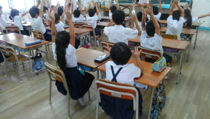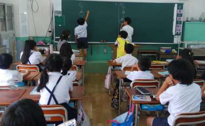 運動場が雨で使えないので、今日は教室でレクリエーションをしました。