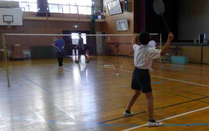 アシスタントの中村芳郎さんと、スマッシュなどを交えたデモンストレーションを見せていただき、子どもたちは、シャトルの「シュッ」という音とともに、休む暇なく続けられるラリーに、思わず「おお!」と感嘆の声をあげていました。