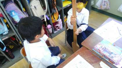 とても長いので、自分と背比べをしたり、「思ったよりかるい!」と感想を話したりしていました。