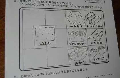 子どもたちは、プリントにかかれたおかずなどを切り抜きながら、この割合のお弁当になるように、思い思いに考えて作っていました。