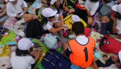「うちの班な、15人おって、じゃんけん2人しか勝たれへんかった。」など、ポイントでのエピソードを話ながら、美味しそうに食べていました。