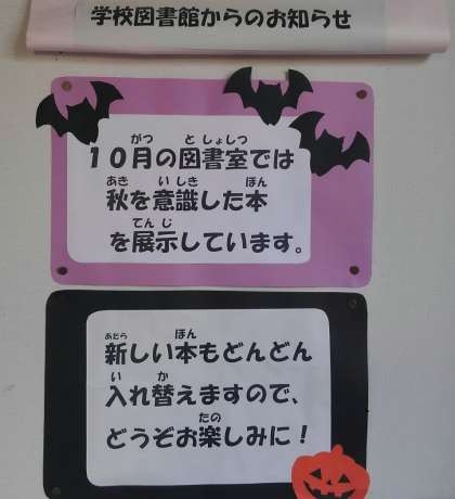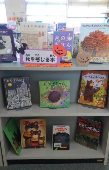 学校図書館の入り口近くのイベントコーナーには、秋を感じる本が集まっています。