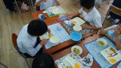 クラスの半分の人が、きょうだい学年の教室に移動して、一緒に今日の献立「ピリからどんぶり、中華スープ、黄桃」を食べました。