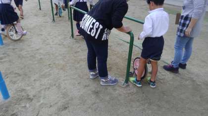 鉄棒につかまって、一輪車に座ることも難しいんです。指導員さんにコツを優しく教えてもらいながら、何度も何度も挑戦していました。