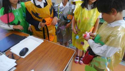 トリート、ホットケーキの材料をくれなきゃいたずらしちゃうぞ。」と職員室にやって来た子どもたち。
