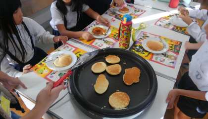 6時間めは、ホットケーキづくりです。おうちの方も手伝いに来てくださいました。ホットプレートできれいに焼いて、みんなで仲良く食べました。よほど美味しかったのか、何枚もおかわりをしてい
