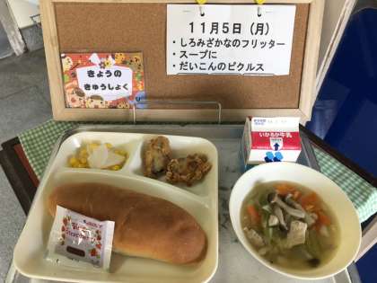 今日の給食の「白身魚のフリッター」は、初登場のメニューです。