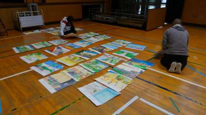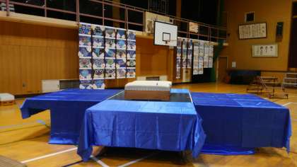 体育館のフロアに置かれた卓球台やテーブルには、きれいな色の布がかかりました。さぁ、どんな作品がこの上に乗せられるのでしょうか。先生方も知恵を絞って展示の工夫をしています。楽しみにしていてくださいね。