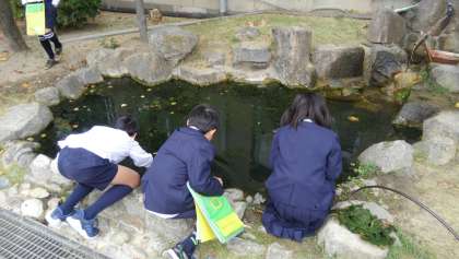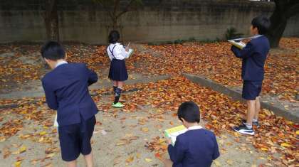 校庭にある桜の木が、黄色や赤に色づき、面白い形の葉っぱが落ちていたのを発見したり、池の水温が、夏は29度もあったのに、今日は16度しかなく、手が冷たくなったことなどを見つけて、ノートにまとめていました。