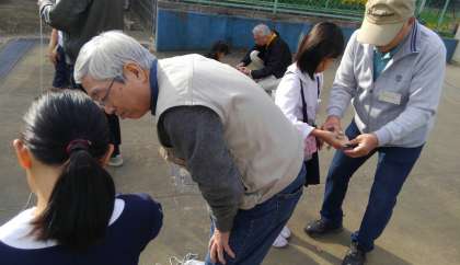 こま回しは、慣れた様子で上手に回せる人もいましたが、ひもを巻き付けるところから教えてもらわないといけない人もたくさんいて、地域の方がとても優しく教えて下さっていました。