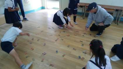 「親」札を叩きつけて、札をひっくり返します。子どもたちは、上からやってみたり横からやってみたりしながら、どうやればうまくいくか、夢中で試していました。