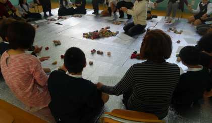 お手玉は、みんなで輪になってに座って、拍子に合わせながらお手玉を送る練習からです。数え歌の最後まで、調子を合わせて送れたときは、みんなから拍手が起こっていました。
