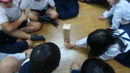 1年生は、下の方からおそるおそる棒引っ張り出すと、ほっと息を吐きながら、上にのせていきます。最後は高学年が倒してしまいました。「うわぁ。」と残念がりながらも、みんなにこにこ顔。どの班も、学年を越えて仲良くなっています。
