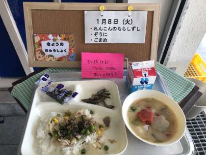 3学期最初の給食は、正月の行事献立ということで、「れんこんのちらしずし」「雑煮」「ごまめ」が出ました。