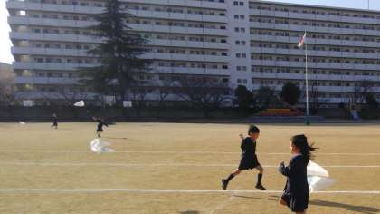 昔からある冬の遊びを楽しもうと、思い思いの絵を描いた凧を作り、広い運動場で飛ばすことにしました。
