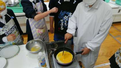 オムレツを作る班では、卵を焼きすぎないように気を付けながら、あらかじめ炒めておいた具材を入れて、手際よく、くるりと包んでいました。