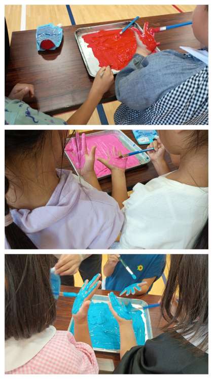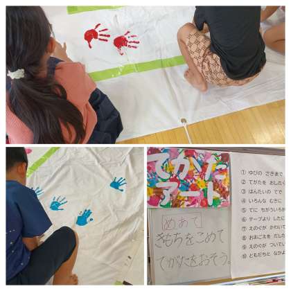 今日の1年生を皮切りに、全校児童と教職員の手がたで作っていきます。出来上がりが楽しみです。