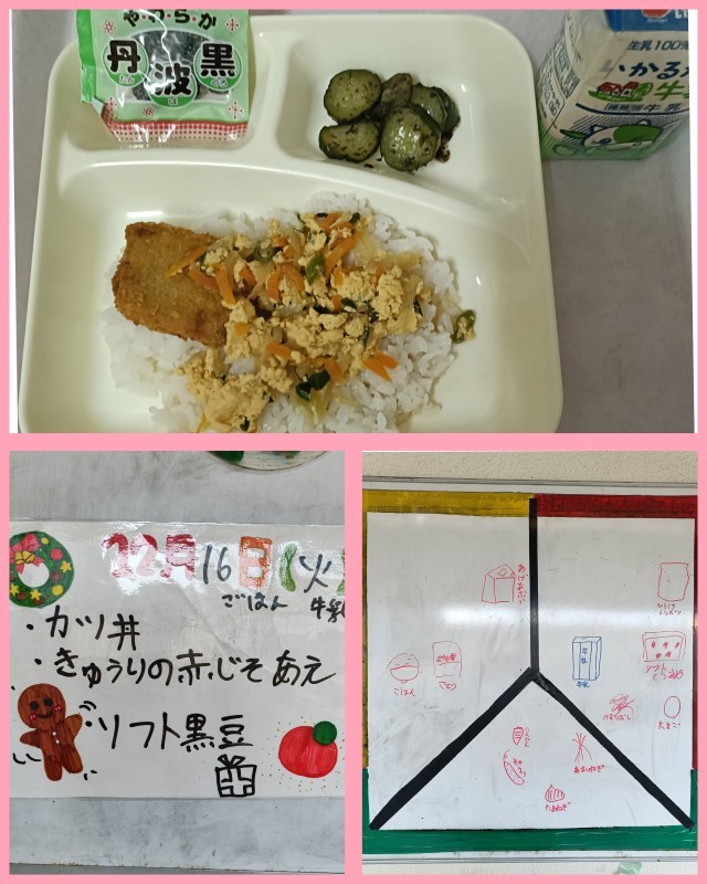給食のカツ丼は、けずりぶしでとっただしで、玉ねぎ、人参を煮て、砂糖、みりん、塩、しょうゆで味付けし、