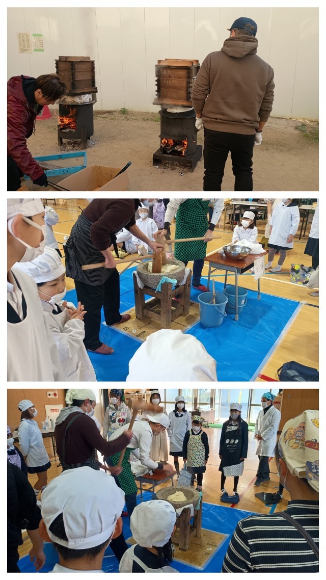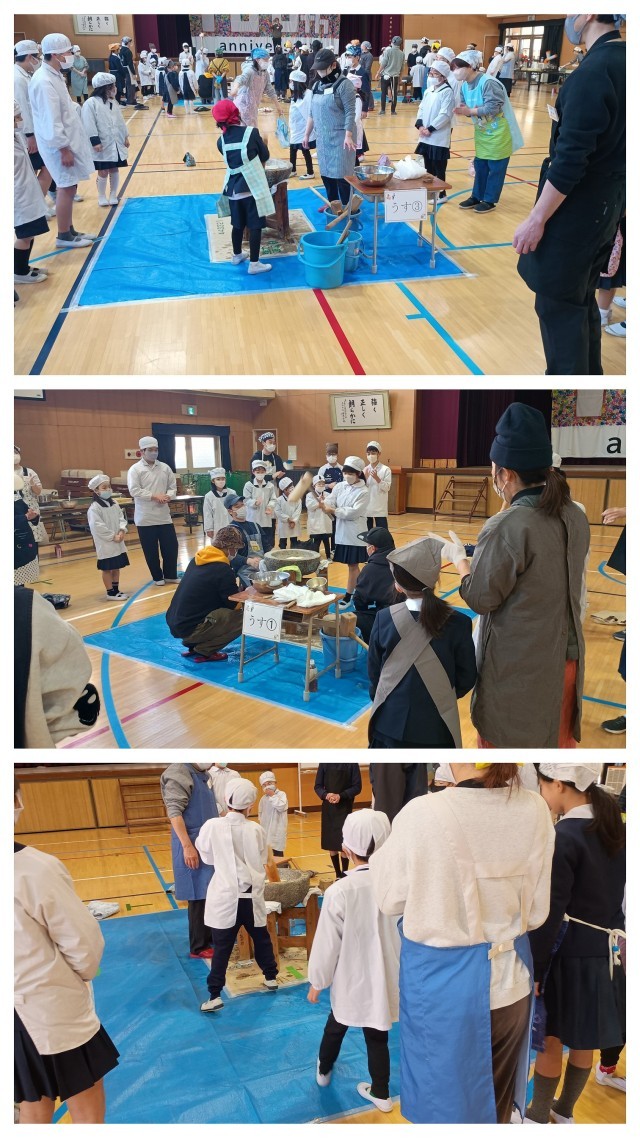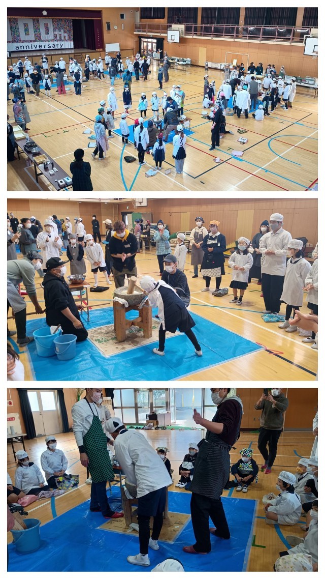 土曜授業でもちつき大会が行われました。「よいしょ、よいしょ!」という元気な掛け声とともに、蒸し上がったもち米が次第にお餅へと変わっていきました。子どもたちも実際にもちつきを体験させていただき、笑顔に包まれたもちつきとなりました。