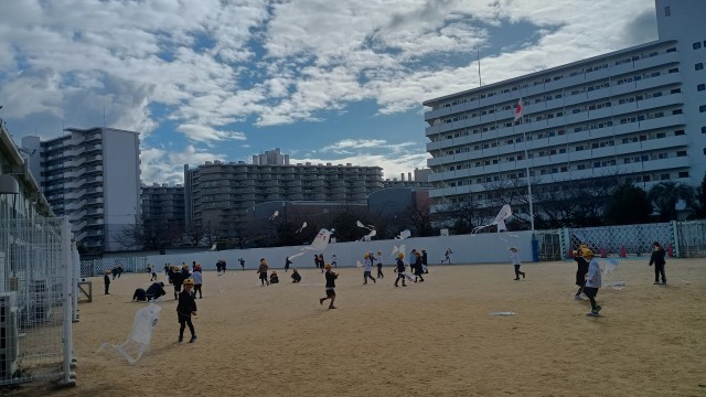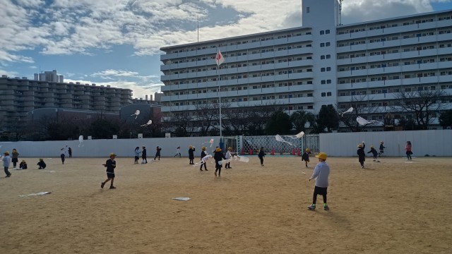 運動場から楽しそうな声が聞こえてくると思ったら、1年生が凧揚げをしていました。