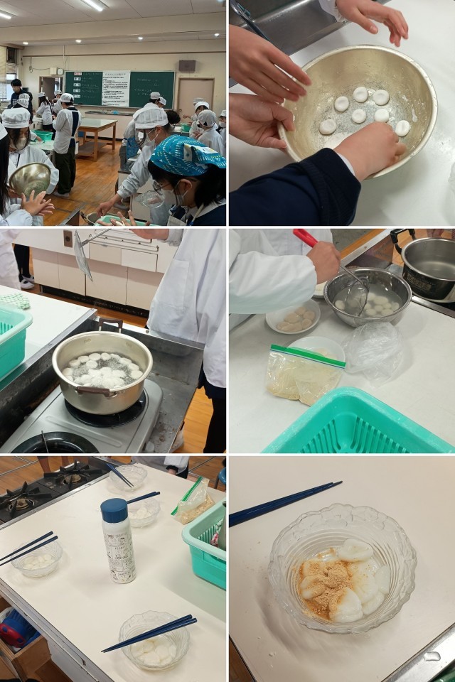 5年生が調理実習で「白玉だんご」作りに挑戦しました。白玉粉に少しずつ水を加え、耳たぶほどの硬さになるまで丁寧に練り上げます。表面を滑らかに丸めたら、沸騰したお湯で茹でて完成です。仕上げにきな粉をまぶして、みんなでおいしくいただきました。