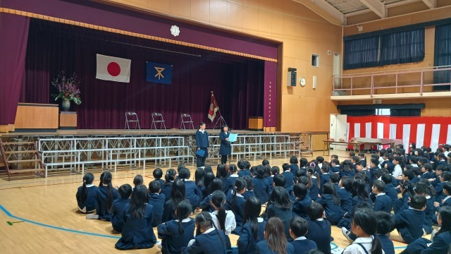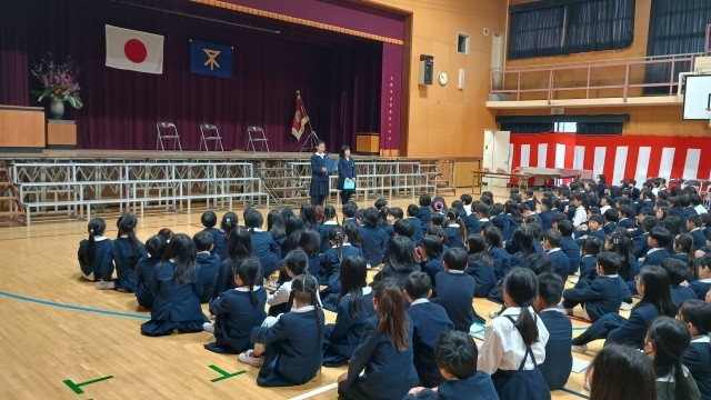 大阪市歌斉唱のあと、3・4年生の代表児童が「3学期に頑張ったこと」や「次にチャレンジしたいこと」などを発表しました。続いて、5年生の代表児童が修了証を受け取り、最後に全員で校歌を歌いました。