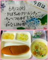 本日の給食は ・かぼちゃのクリームシチュー ・キャ...