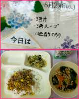 本日の給食は ・3色丼 ・3色スープ ・3色酢のもの ...