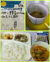 本日の給食は ・一口がんものみそ煮 ・牛肉と野...