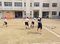 3年生はラインサッカーを学習しています。サイドラインにラインズマンがいるので、自分のチームにボールを回したい時には一度あえて外にボールを出し、ラインズマンにパスを出してもらいます。途中しっかり作戦会議...