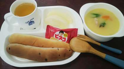 今日の朝ごはんやさんのメインは、あったかコーンクリームスープでした。