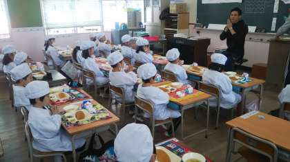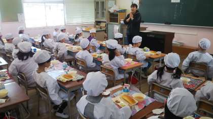 今日の目玉メニュー(?)は、かぼちゃパンです。生地にかぼちゃペーストを練り込んだ、かぼちゃの色をしたコッペパンで、ほんのり甘くやわらか!今日のおかずとの相性も抜群で、子どもたちは今日も美味しそうに給食を食べていました。毎日の給食、楽しみにしてくれている子が多いです!