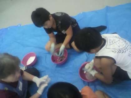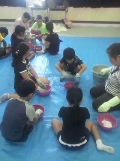 くちゃくちゃとした感触も楽しみながら染めていきました。リズムよくもみ込んでいると自然に掛け声が歌のように出てくる人もありました。