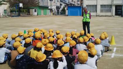 運動場に横断歩道や道路を白線でひき、歩き方や並び方、横断歩道を渡るときの左右確認など、基本的なことをおさらいしながら学習をすすめていきました。