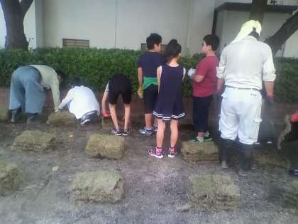 30センチ四方くらいの芝のマットを、1枚ずつ手作業で整地された土の上に順番においていきました。西淡路小学校・淡路小学校の6年生と淡路中学校の3年生で作業をしました。