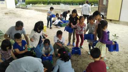 管理作業員さんが作ってくれた“特別な土”を鉢に入れ、各自が選んだ、なすび、ピーマン、ミニトマトの苗を、鉢に植えていきます。