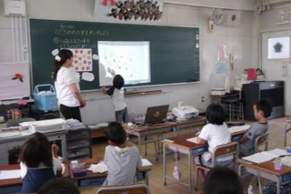 授業の中では、写真にあるように、プロジェクターを使って電子黒板のように写した映像に印をつけたりする方法も行いました。