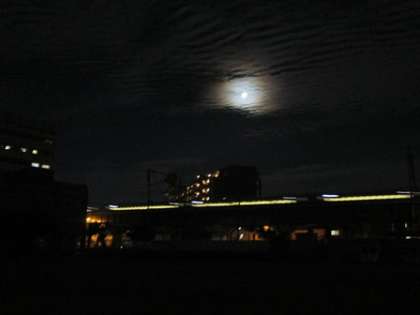 大きさは伝わりにくいですが、運動場から見えた 新幹線の上に輝くスーパームーンです。