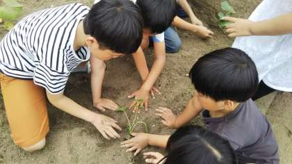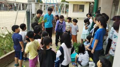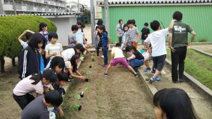 この時期、学習園や鉢植えで花や野菜の種や苗を植えている学年が多いですが、今日は4年生が、ひょうたん、へちま、ゴーヤの苗を学習園に植えに行きました。