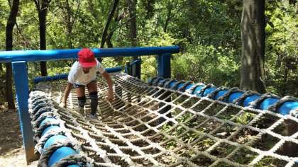たくさんの木製遊具が設置されており、子どもたちは次々とチャレンジしていきました。特にターザンロープやブランコは人気でした!