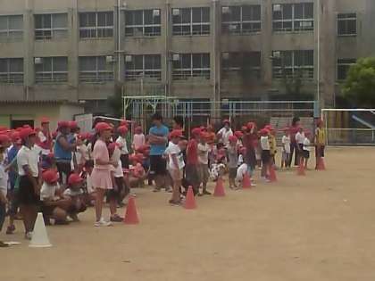 ところが、久しぶりにみんなですること、運動場で声が拡散して響かないことなどが影響したのか、いつもの迫力がありません。少し残念でしたが、次回に大いに期待したいと思います。