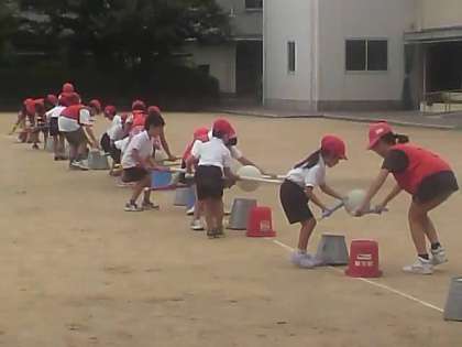 2本の棒を低学年と高学年で1本ずつもち、バケツの上のボールを挟んで隣のバケツに移します。みんなで協力し合って、楽しみました。高学年が低学年をリードしたり気づかったりする様子が微笑ましかったです。