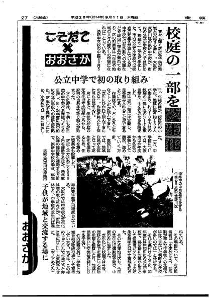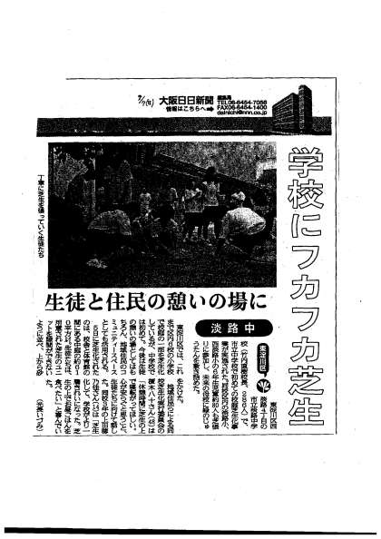 9月5日(金)に、淡路中学校であった見学会の際、淡路中学校の中庭の芝生化に向けた作業を、淡路中学校の3年生、淡路小学校・西淡路小学校の6年生、そして地域の方々で協働して行いました。その様子が7日(日)の大阪日日新聞と11日(木)の産経新聞で紹介されました。