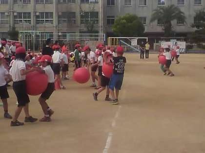 運動会で行う、『ギュッとして!グッとして!ランランラン』をたてわり班で練習しました。高学年と低学年がペアで、大きなボールをおなかではさみ、コーンを回ってリレーします。