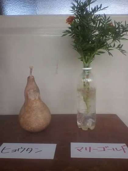 もう一つは、畑で採れたひょうたん。数は少なかったのですが、大きなものも生りました。小さな千成びょうたんも少しできています。