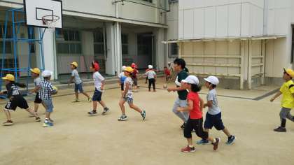 運動場を見ると、たくさんの先生が子どもたちと楽しそうに遊んでいます。