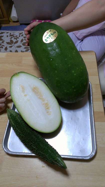 7月17日水曜日の給食は『夏野菜マーボーどんぶり』です。そこに入っている【とうがん】という野菜は、実はこんなに大きな実なんです。なかなか見る機会が少ないだろうということで、調理員さんの提案で、調理前に写真撮影をして、皆さんに紹介することにしました。
