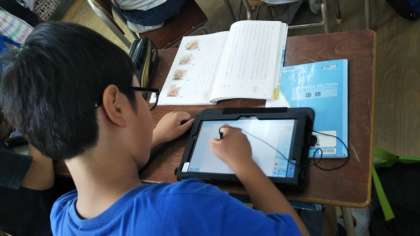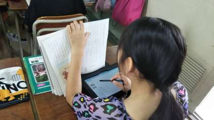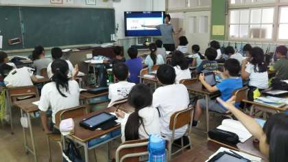 その答えを、各自が自分のタブレットに入力し、全員の答えを前の大型ディスプレイに映し出しす、という使い方をしました。